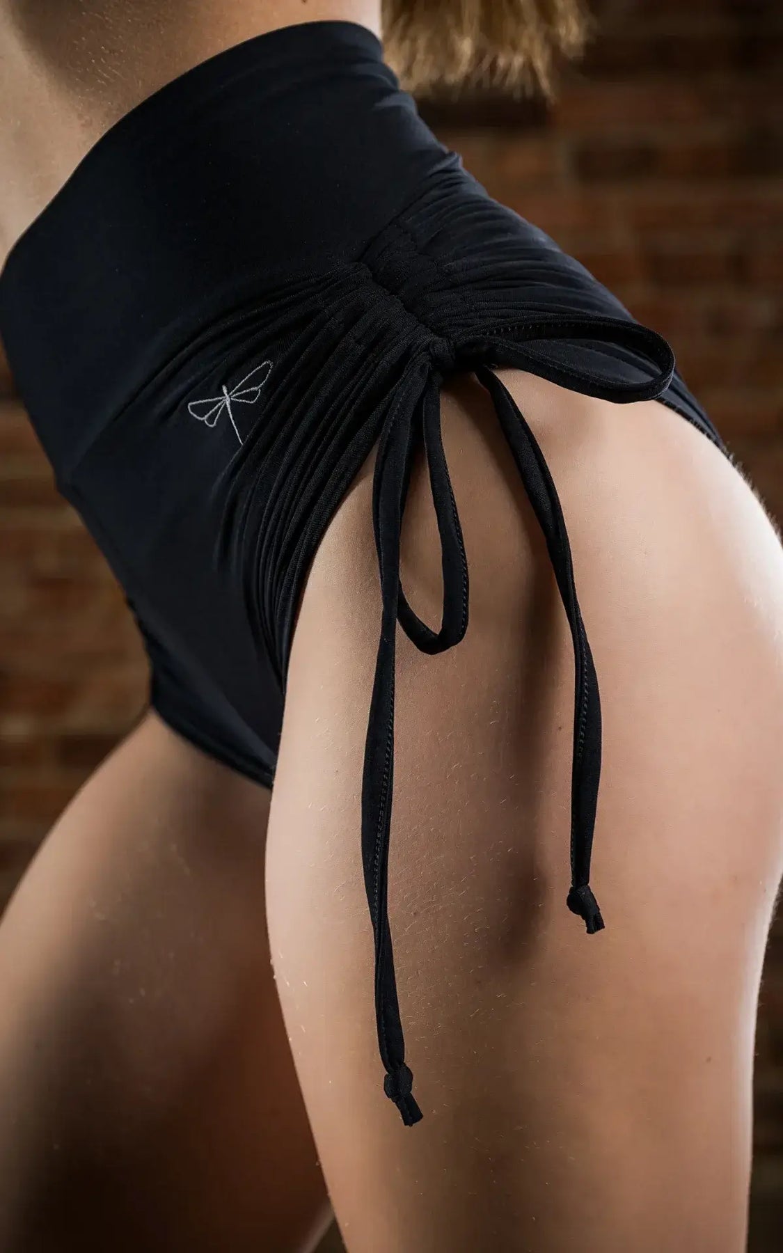Seznam se se svými univerzálními šortkami do studia - pole dance šortky se stahovacími šňůrkami. Vysoký pas tě drží jistě, nastavitelné šněrování po stranách ti dovolí měnit délku i krytí — kratší na pole, delší na Bikram/Hot yogu. Hladké, přiléhavé provedení drží na místě při výstupech, invertu i v horku a zakryje, co má, i při vysoké intenzitě. Decentní vyšívané logo Dragonfly je pečeť prémiové kvality.